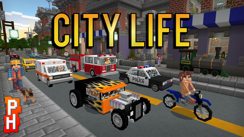PixelHeads presets City Life: Welcome to City Life, a world where you role-play life in the city! Cruise the streets in a police car or any of the 8 other vehicles, save the day as a firefighter or take your dog for a walk.- Drive Firetrucks, Motorbikes, Cars, Trains, Ambulances, Taxis, Police Cars, All-Terrain Vehicles & Hot Rods!- Bandits, Police Officers & Dog Pets!- A modern-day city!. City Life is a Minecraft Bedrock Marketplace Worlds (DLC) that can be purchased in Minecraft for 490 Minecoins.